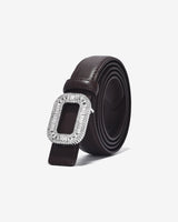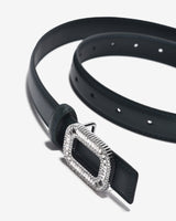 Nịt da nữ Zucia đầu nịt được thiết kế hình chữ nhật bo tròn, phủ kín bởi hàng loạt viên đá cắt cạnh sắc sảo, tạo hiệu ứng lấp lánh mạnh khi bắt sáng. Phần chốt nịt ẩn nằm phía sau khóa, giúp mặt khóa giữ được độ phẳng và tinh tế tối đa khi nhìn trực diện. Tổng thể tạo cảm giác như một món trang sức thu nhỏ, nổi bật ngay cả khi đi cùng outfit tối giản.
