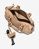Chiếc túi sở hữu tông vàng trung tính hiện đại, dễ kết hợp trang phục mà vẫn tạo điểm nhấn vừa đủ. Dáng trụ bo tròn mềm mại kết hợp phần nắp gập góc cạnh, tạo nên sự đối lập thú vị trong thiết kế. Bề mặt chất liệu xử lý vân nhẹ, cầm tay chắc chắn. Điểm nhấn đáng yêu nằm ở charm hình chim đính kèm – với tạo hình thủ công phối màu đen và vàng đồng điệu, mang lại chút phá cách nhẹ cho phong cách thường ngày.