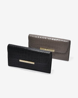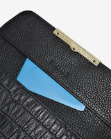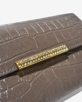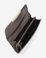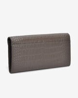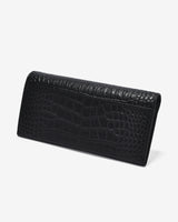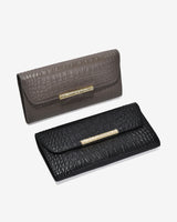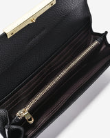 Ví dáng dài dập vân sang trọng, nổi bật với điểm nhấn kim loại đính đá sáng ở trung tâm. Thiết kế nắp gập bo cong mềm mại, tổng thể thanh lịch và cuốn hút. Phù hợp cho những dịp trang trọng hoặc phối cùng trang phục dạo phố đầy phong cách.
