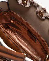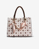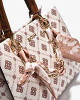 Mẫu túi sở hữu phom dáng gọn gàng, mang lại cảm giác vững chãi và chững chạc ngay từ cái nhìn đầu tiên. Các biểu tượng thương hiệu xuất hiện như dấu ấn lặng thầm, đều đặn nhưng không đơn điệu. Hai tay cầm dáng cong màu nâu ấm giúp cân bằng thị giác, kết nối hài hòa giữa phần thân túi và chi tiết kim loại ánh vàng sang trọng. Chiếc khăn lụa vắt nhẹ trên quai như một dấu chấm phá mềm mại, giúp tổng thể trở nên thanh thoát hơn và tăng thêm nét tinh tế đầy nữ tính. Một chiếc túi đơn giản mà luôn tạo dấu ấn, dịu dàng, tinh tế và rất đáng nhớ.